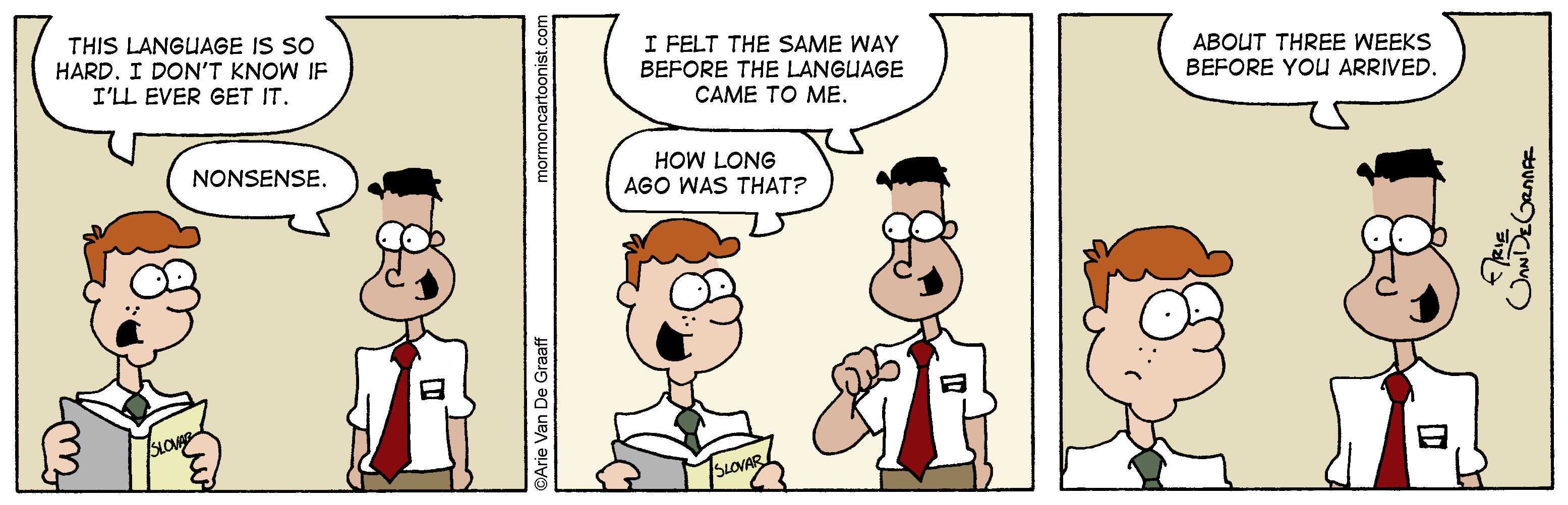 Today's strip isn't far from the truth. In fact, I suspect that for many missionaries, they don't start getting comfortable with a foreign language until they are working with a junior companion who understands far less than they do.